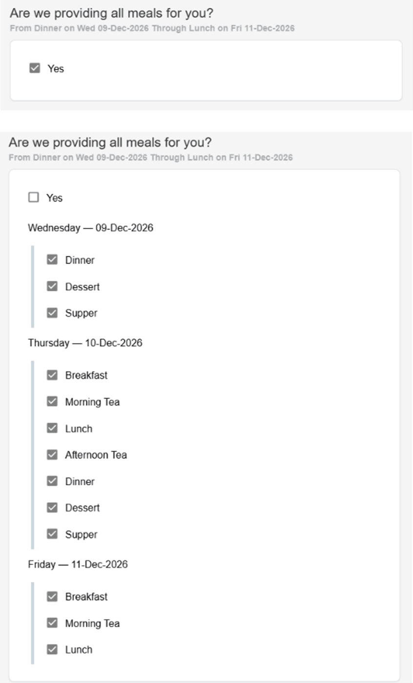 By default, All meals box is ticked as yes if attendees are not eating all meals untick the yes box. Then untick any meals you are not eating. and leave only the meals the attendee is eating ticked.