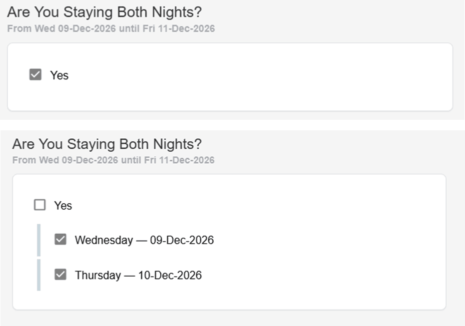 By default, ‘Are You Staying All Nights’ box is ticked as yes if attendees are not staying all nights untick the yes box. Then untick the nights they are not staying. leave only the nights the attendee is staying ticked